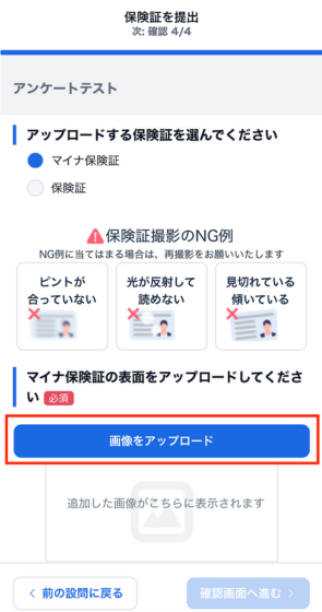 保険証を選択し、撮影した資格確認書・保険証をアップロードしてください。