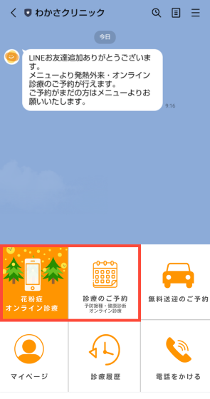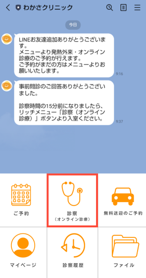 LINEトーク画面より「オンライン診療のご予約」をタップしてください。